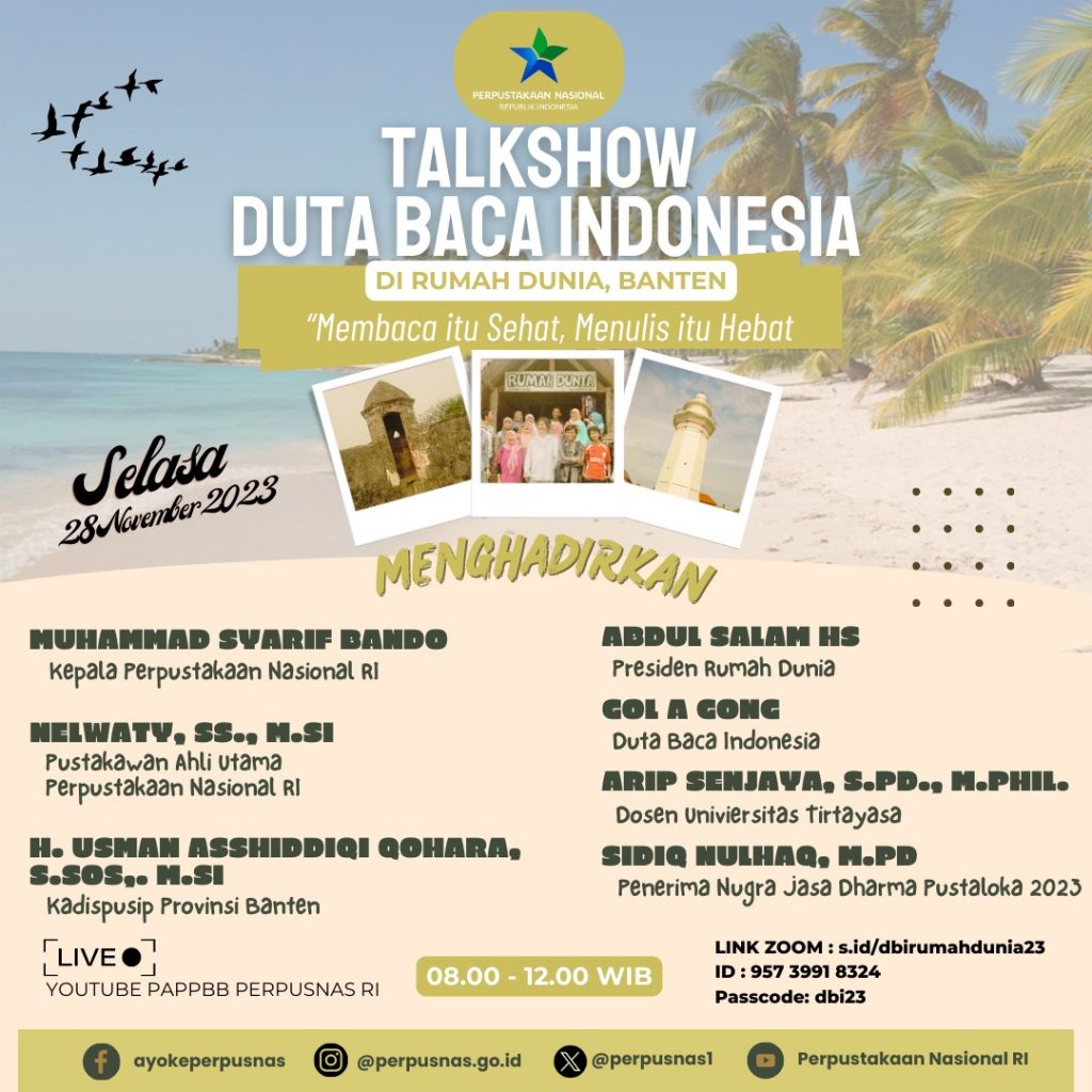 Selasa pagi, tanggal 28 November 2023, Rumah Dunia sukses berkolaborasi dengan Perpusnas RI dalam menggelar Talk Show Duta Baca Indonesia dengan tema Membaca Itu Sehat, Menulis itu Hebat. Dalam kegiatan tersebut, saya didaulat menjadi Ketua Acara dan dibantu oleh teman-teman Relawan Rumah Dunia yang lain.