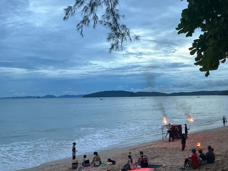 Sore menjelang senja, alih – alih menyaksikan sunset nan indah, kala siluet senja tertutup awan mendung, kami menghibur diri dengan menikmati atraksi kobaran api yang saya sendiri tidak tahu namanya dengan iringan dentuman musik keras.