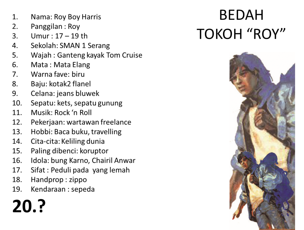 Nah, siapakah Roy dari 19 nomor bedah tokoh di atas? Cluenya adalah “kamera”. Berarti narasi di atas adalah cara menunjukkannya kepada pembaca. Roy adalah seorang wartawan.