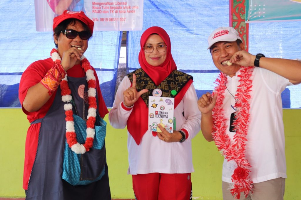 Paman Gong juga menjelaskan kegiatan ini terlaksana atas dukungan dari Sekolah Enuma Bahasa Indonesia dan Perpusnas RI. Sekolah Enuma adalah aplikasi belajar Bahasa Indonesia melalui digital. “Hadiah untuk anak-anak dan guru dari Sekolah Enuma Bahasa Indonesia,” ungkap Paman Gong.