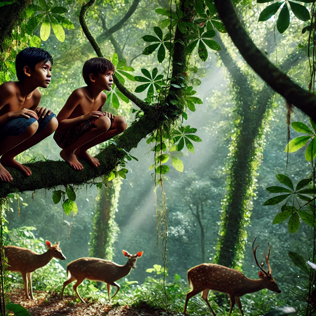 “Kau harus sabar, baru saja matahari sepenggalah. Kau juga jangan mengeluh meskipun berpeluh. Mencari rusa tidaklah mudah Dik. Sifatnya lincah, juga dapat membedakan gerak-gerik semak belukar: mana yang tertiup angin, mana yang menjadi tempat manusia mengintip. Teranglah hewan-hewan itu terus bersembunyi.”