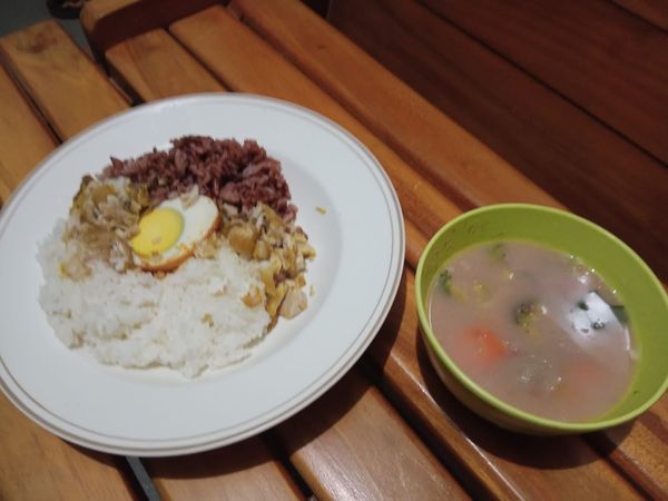 Hubby ingin makan yang lembut, karena gigi sedang bermasalah. Oke, nasi putih dan nasi merah aku kukus aja biar kayak nasi tim ala-ala. Ayam goreng kuiris tipis, lalu ditata bersama setengah telur rebus dan dikukus. Sebagai kuahnya sedikit sayur dimasak dengan kornet sapi. Nasi merah sudah keras hanya hangat saja jadinya. Yasudahlahya, yang penting gaya di penampilan. ![]()