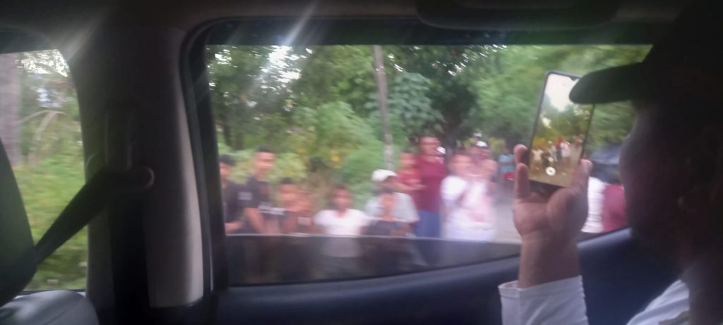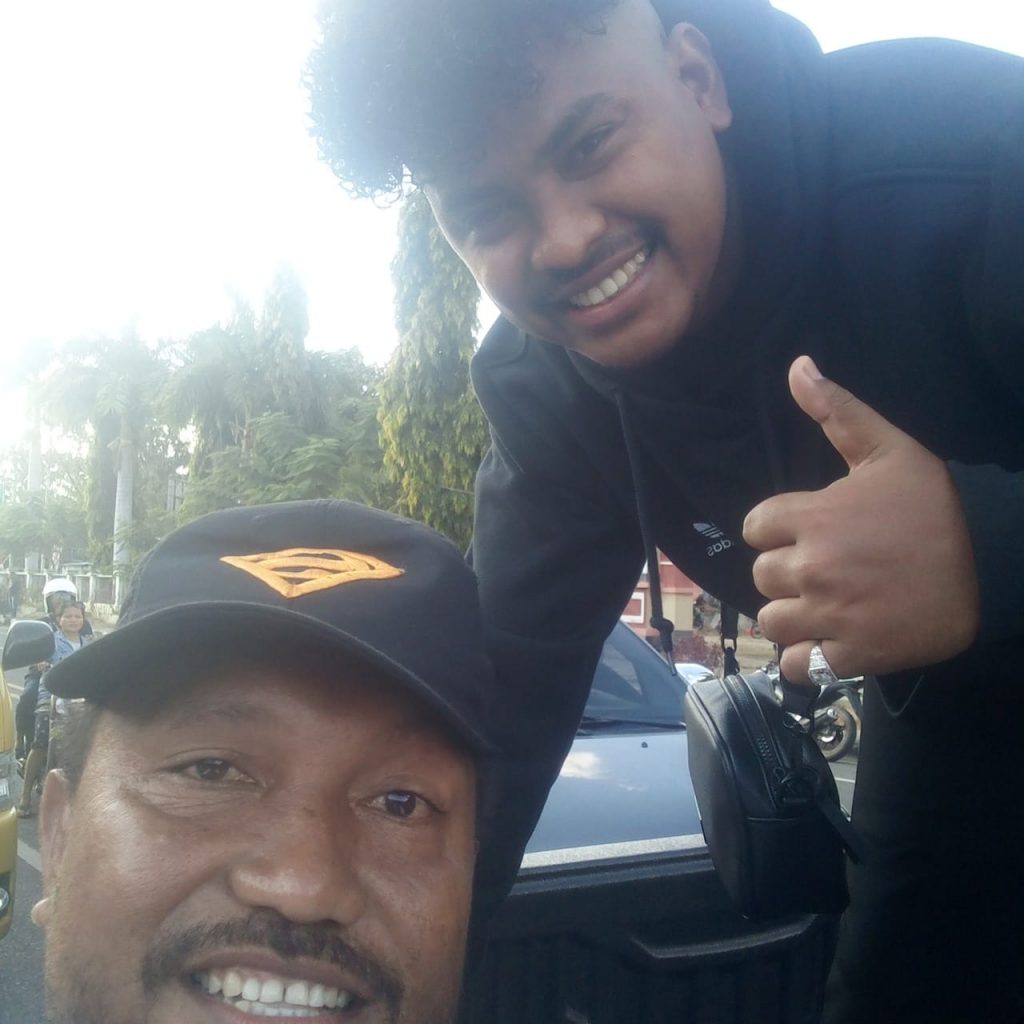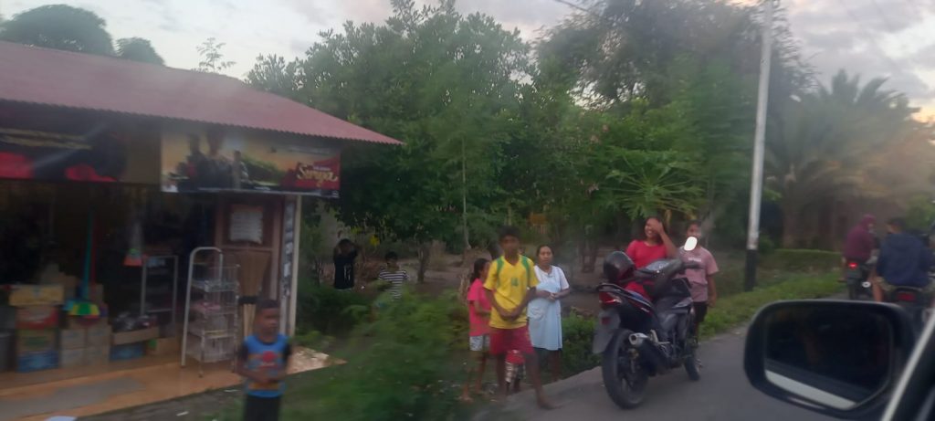 Justin Aldrin sebagai bintang tamu utama berada di mobil bak terbuka warna merah. Di sepanjang jalan kota Lembata, Justin Aldrin menyapa ramah para penggemarnya dengan senyuman.