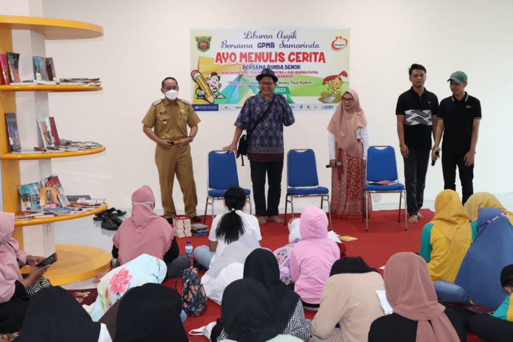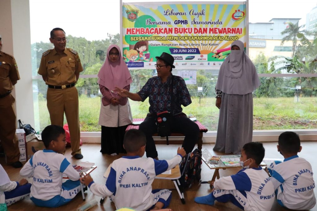 Wakil Walikota Samarinda Dr. H. Rusmadi Wongso menyambut di pintu masuk gedung perpustakaan. Saya dibawa mampir dulu ke ruang baca anak-anak. Ramai sekali dengan celotehan anak-anak. Rupanya GPMB Samarinda mengadakan kegiatan Membacakan Buku dan Mewarnai. Saya diberi kesempatan bercerita. Tentu saja saya senang. Saya bercerita Persahabatan Keluarga Cacing dan Keluarga Ayam.