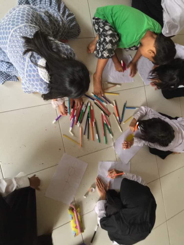 Selesai membaca, anak-anak kuminta menggambar orang di kertas HVS ukuran A4. Kukenalkan teknik menggambar manusia yang proporsional dengan metoda lingkaran bertumpuk. Ini pernah kupelajari di Kelas Kang Maman Mantox. Satu bagian untuk kepala, satu badan, dan sisanya kaki.