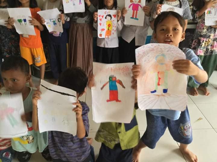 Setelah tampak pola serupa tubuh manusia, kuminta mereka melengkapi gambarnya sesuai keinginannya, lalu mewarna. Tampak wajah anak-anak yang semula penuh tekanan berubah menjadi riang. Kutebak mereka telah berhasil melewati tahap ketakutan memulai.