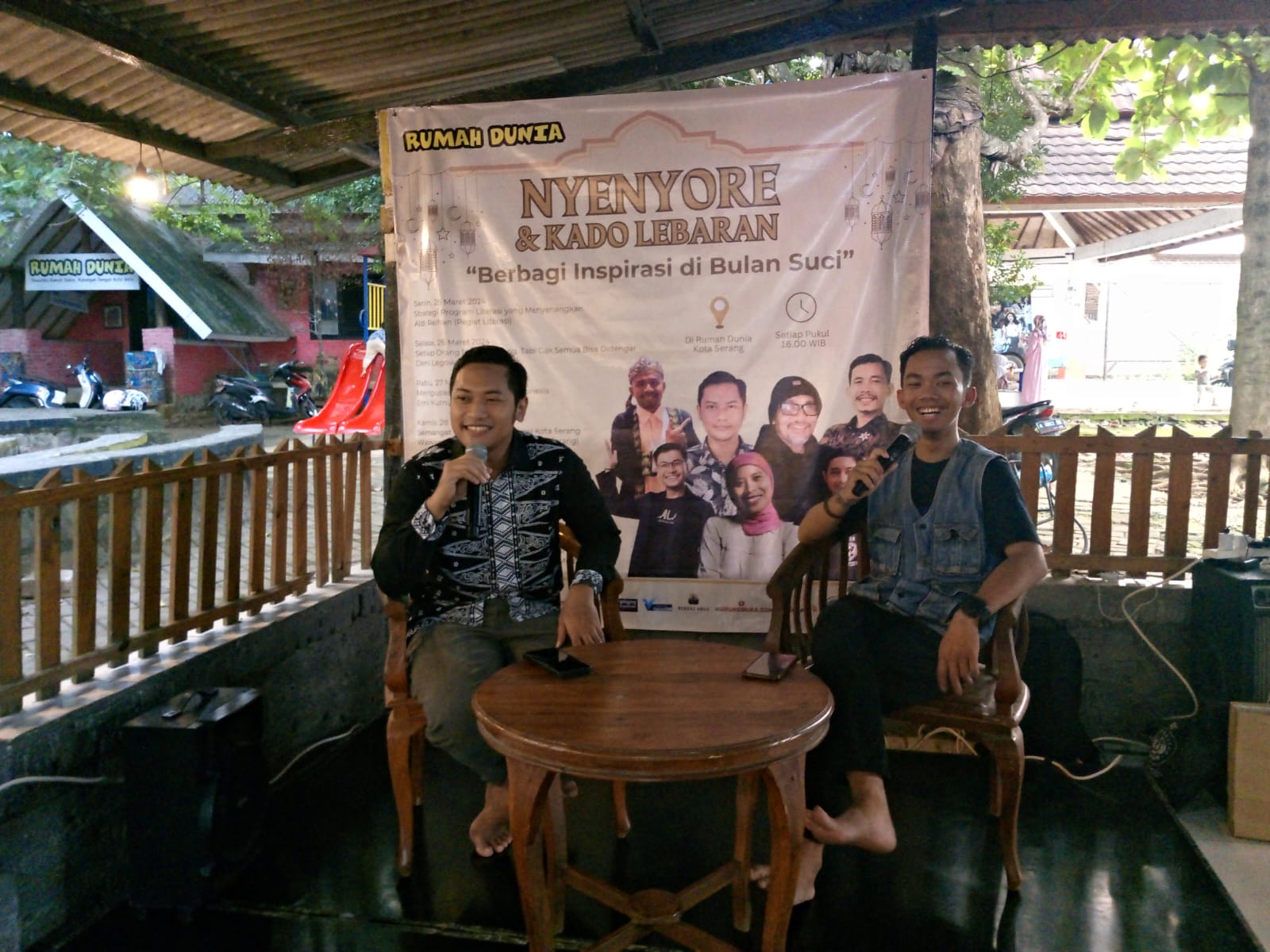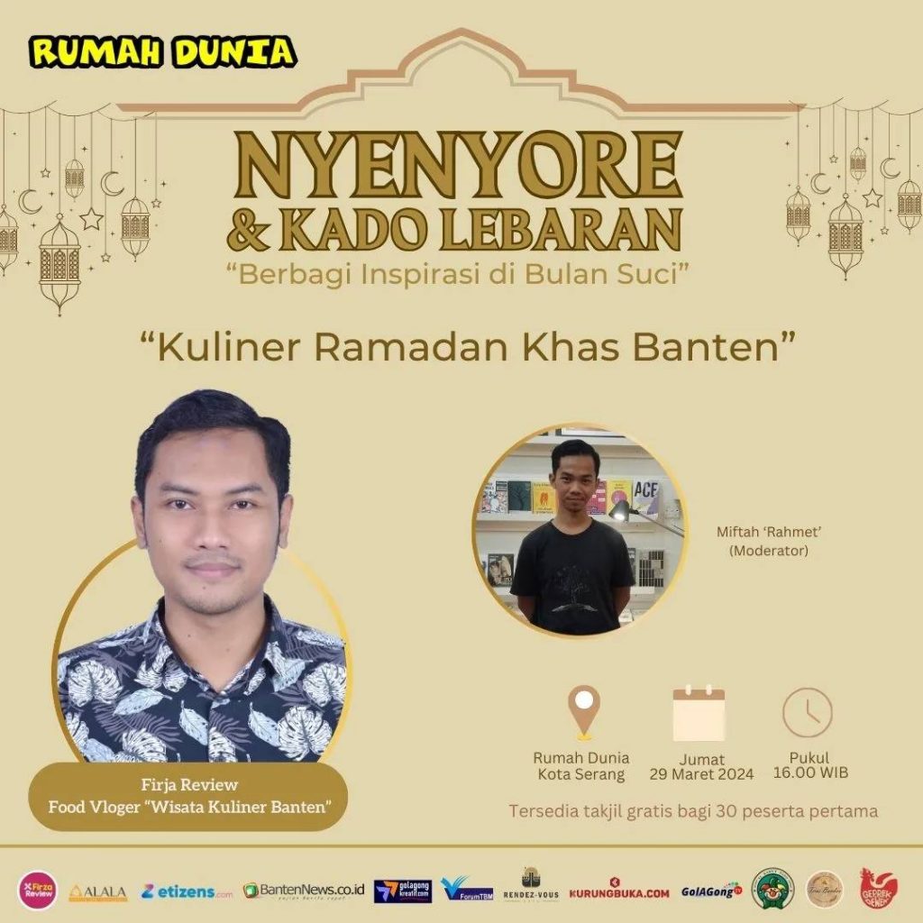Nyenyore dan Kado Lebaran Rumah Dunia di hari ke-5 menggelar kegiatan diskusi terkait wisata kuliner yang ada di bulan puasa, berlokasi di Cafe Randez-Vous, Rumah Dunia, Serang. Selasa 29/03/2024. Tema diskusi yang diangkat yaitu “Kuliner Ramadhan Khas Banten” menghadirkan Food Vloggler Wisata Kuliner Banten, yaitu Firza Review.