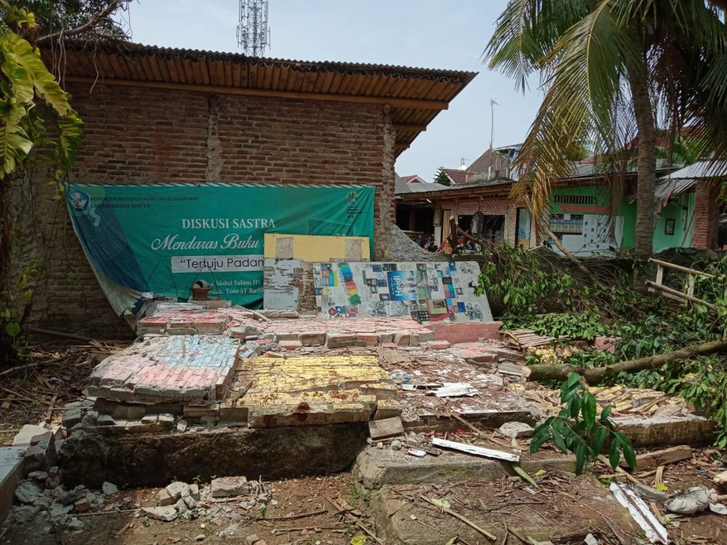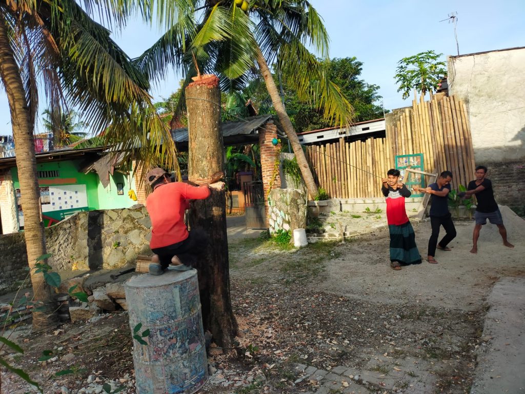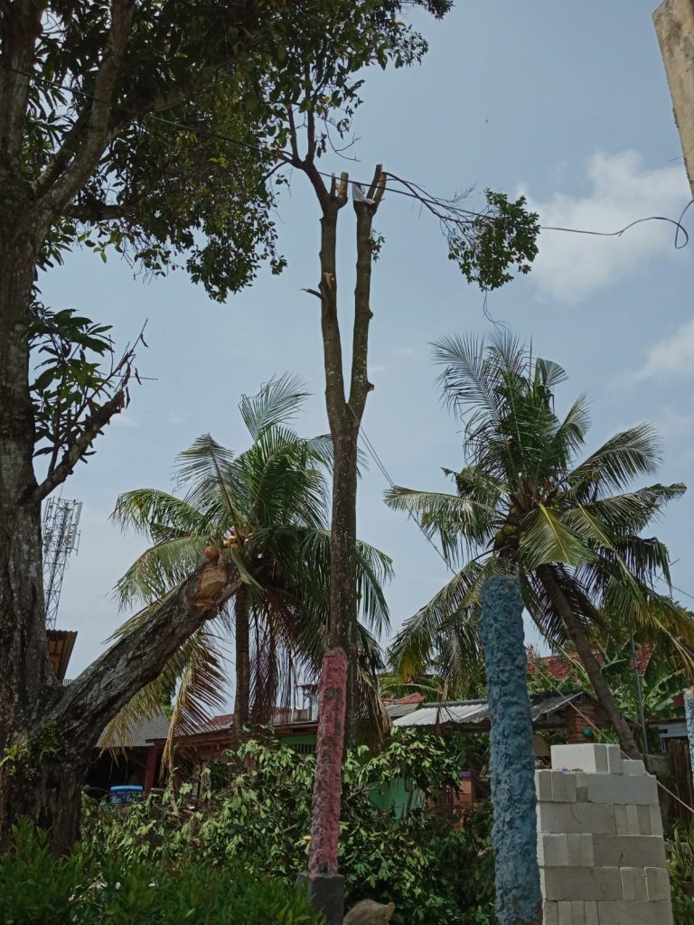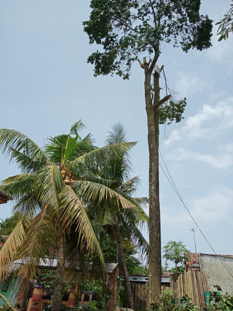 Akhirnya keputusan harus diambil. Pohon Salam pun dibonsai walaupun areal Museum Literasi Gol A Gong jadi panas. Saya harus menanam pohon yang baru, agar tetap teduh. Mang Ade menebangnya, dibantu Fadli.