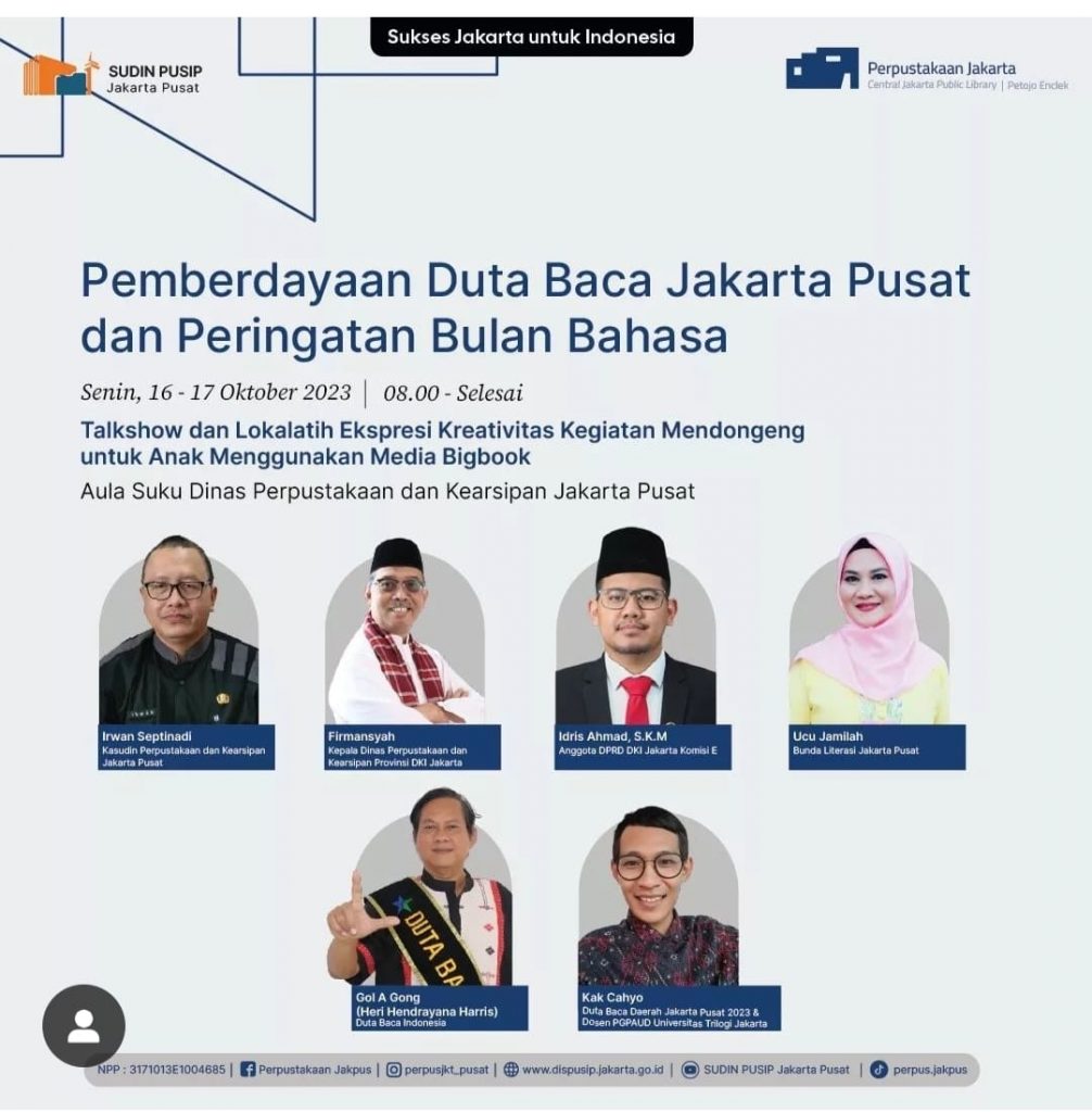 Acara talkshow diisi oleh Gol A Gong (Duta Baca Indonesia) sebagai Celemek Ajaib Paman Gong, Kak Cahyo (Duta Baca Jakarta Pusat) dan Idris Ahmad .