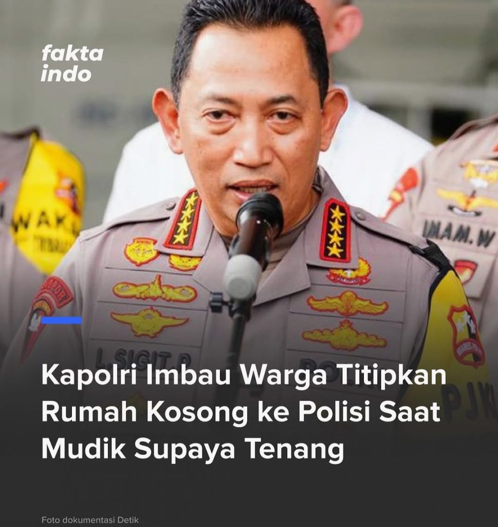 Kapolri Jenderal Pol. Listyo Sigit Prabowo mengimbau masyarakat yang akan mudik Lebaran untuk melaporkan rumah kosong ke kepolisian terdekat guna mendapatkan penjagaan dari potensi tindakan kriminal.