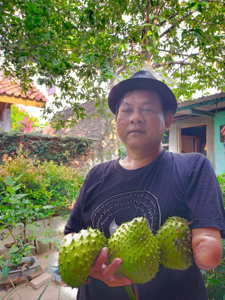 Sekarang serba buah-buahan. Di rumah ada pohon sirsak. Menyedihkan. Istriku memang kejam, ya. Tapi ini untuk kesehatan. Terutama pasca operasi fistula di sekitar pantat. Ya, harus aku terima dulu demi kesehatan.