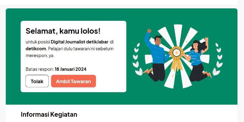Setelah lolos pada seleksi berkas, psikotes, tugas dan user interview di detikcom. Saya mendapat email dari Kampus Merdeka pada Senin sore, 15 Januari 2024 bahwa saya diterima magang di detikcom. “Selamat, detikcom menerima kamu untuk Digital Journalism di detikJabar” tulis email dari Kampus Merdeka sambil mengarahkan ke link kampusmerdeka.com untuk menerima penawarannya.