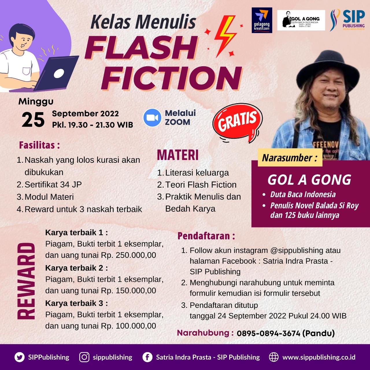 Setelah kelas selesai akan ada praktek menulis. Bagi peserta yang karyanya lolos kurasi, akan diterbitkan oleh SIP Publishing dan bisa satu buku dengan Gol A Gong