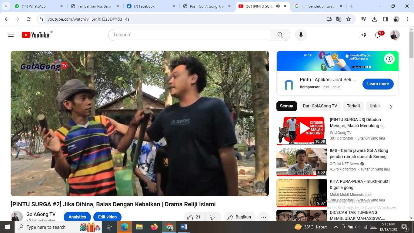 “Pintu Surga” GolAGong TV ini produksi Kelas Film Rumah Dunia yang dimotori Rudi Rustiadi, Setiawan Jodi Fakhar, Jordy Alghifari. Terima kasih kepada Emak-emak Kampung Ciloang, dan anak-anaknya yang sudah ikut meramaikan film pendek ini.
