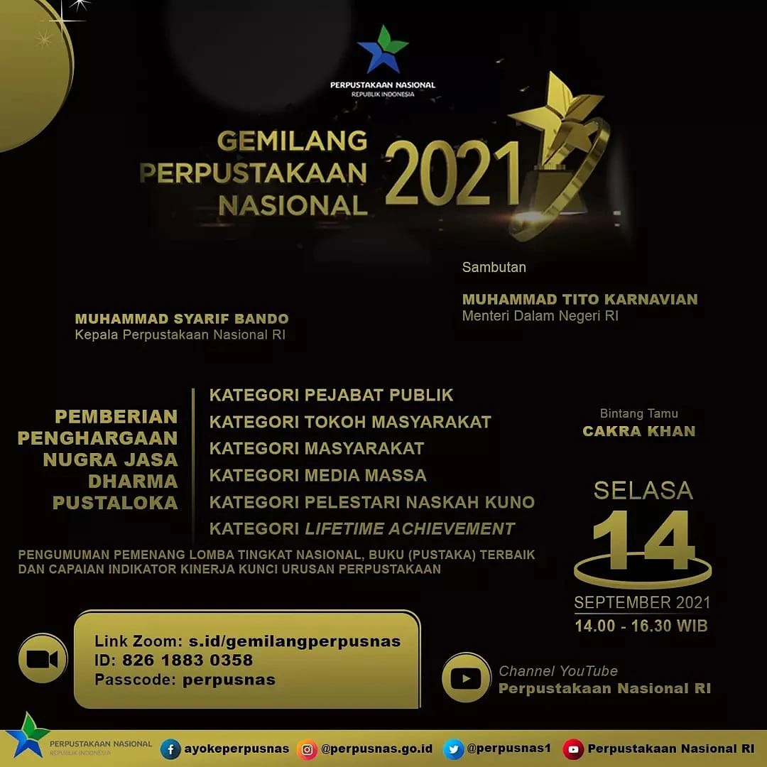 Bertepatan dengan Hari Kunjung Perpustakaan dan Bulan Gemar Membaca yang diperingati setiap tanggal 14 September, Perpustakaan Nasional memberikan penghargaan tertinggi kepada berbagai pihak yang telah berkontribusi besar terhadap pengembangan perpustakaan dan pembudayaan kegemaran membaca yaitu Nugra Jasa Dharma Pustaloka, yang akan dirangkaikan dengan pengumuman pemenang Lomba Tingkat Nasional, Buku (Pustaka) Terbaik, dan Capaian Indikator Kinerja Kunci Urusan Perpustakaan dalam rangkaian acara Gemilang Perpustakaan Nasional.