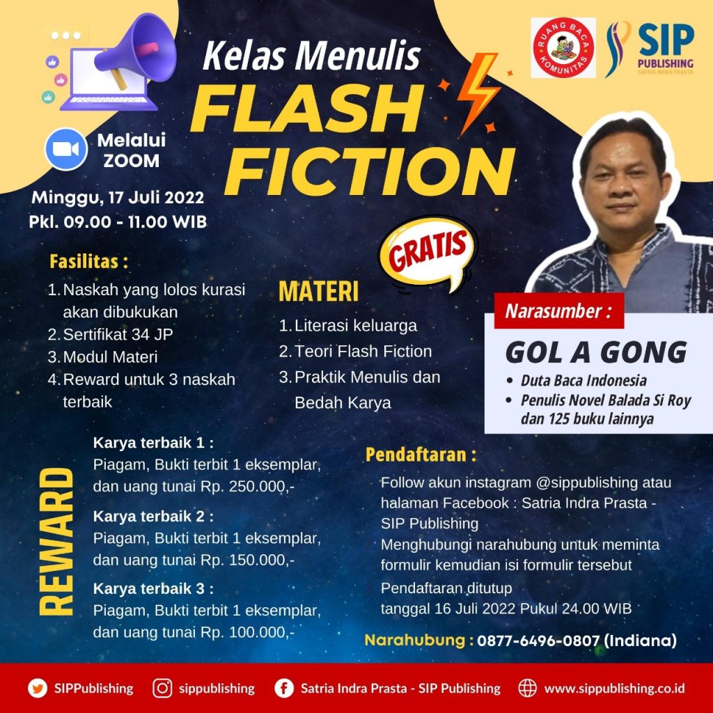yo, Kelas menulis cerpen jenis flash fiction bersama Gol A Gong online. Silakan daftar melalui narahubung dengan cara klik tautan di bawah ini