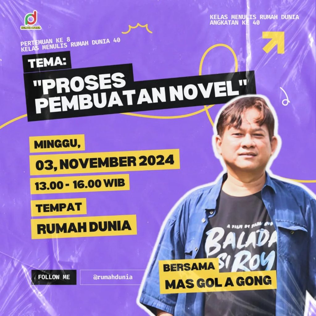 Halo sahabat literasi! Salam cinta untuk semua pembaca. Rumah Dunia akan mengadakan Kelas Menulis Rumah Dunia (KMRD) pertemuan kedelapan untuk angkatan yang ke-40. Pelatihan ini akan diisi oleh Gol A Gong, Duta Baca Indonesia periode 2021-2025. Tema yang diangkat adalah “Penulisan Novel.”