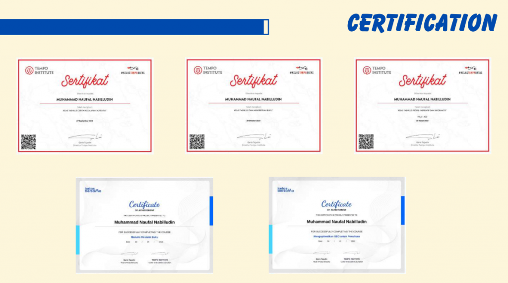 Tahun 2023, saya mulai serius mengalokasikan uang bukan untuk beli saham atau kripto, tapi untuk ikut kelas menulis di Rumah Dunia dan Tempo Institute. Biaya kelasnya bervariasi, mulai dari Rp100.000 sampai Rp300.000. Saya ikut lima kelas dengan total biaya kurang dari Rp1 juta. Tapi dari situ saya dapat return 14 kali lipat: diterima magang di detikJabar lewat program MSIB batch 6 dari Kemendikbudristek.