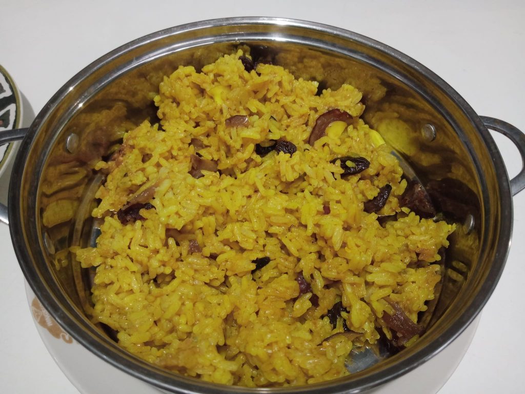 Nasi biryani kali ini kutambah kurma China, almond iris, wijen panggang, kismis dan cengkeh. Jangan khawatir, saat mengaron sudah kutambahkan garam.