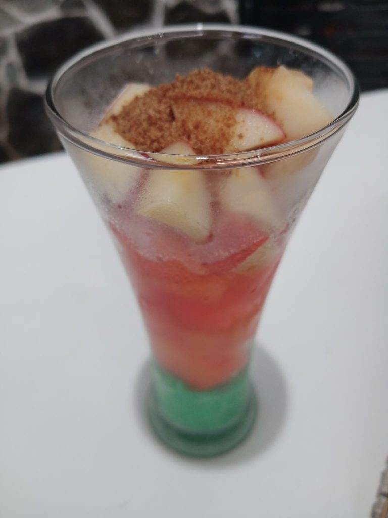 Aku lalu fokus bikin minuman dan snack ifthar. Ada pepaya potong beku. Apel beku kupotong dadu, dikucurin perasan jeruk.