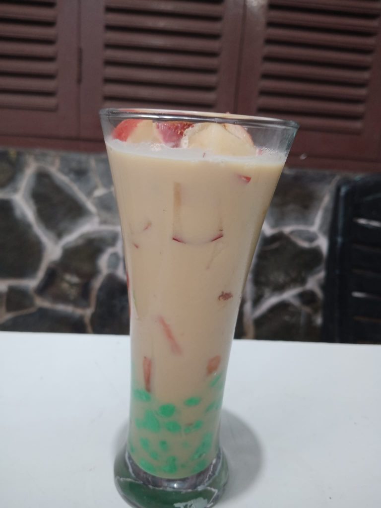 Trus lihat ada stok yoghurt. Ada krimer sachet. Campur dengan gula aren, blender sampai larut. Mirip santan di mataku. Entah bagi kalian.