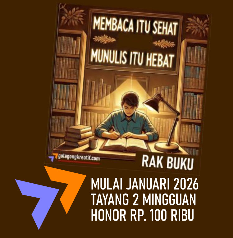 Rak Buku: Mulai Januari 2026 tayang 2 minggu sekali, setiap hari Selasa, gantian dengan LAYAR BIOSKOP. Rak Buku adalah resensi buku. Upayakan tulisannya membangun suasana lokasi membaca, personal literatur. Boleh juga menulis seperti catatan perjalanan. Panjang tulisan 500 hingga 700 kata. Redaksi menyediakan Honor Rp100 ribu. Sertakan foto diri sedang membaca bukunya, foto cover bukunya dalam bebreapa pose, bio narasi singkat dan foto profil, identitas buku, nomor WA, rekening bank. Kirim ke email golagongkreatif@gmail.com dengan subjek: Rak Buku.