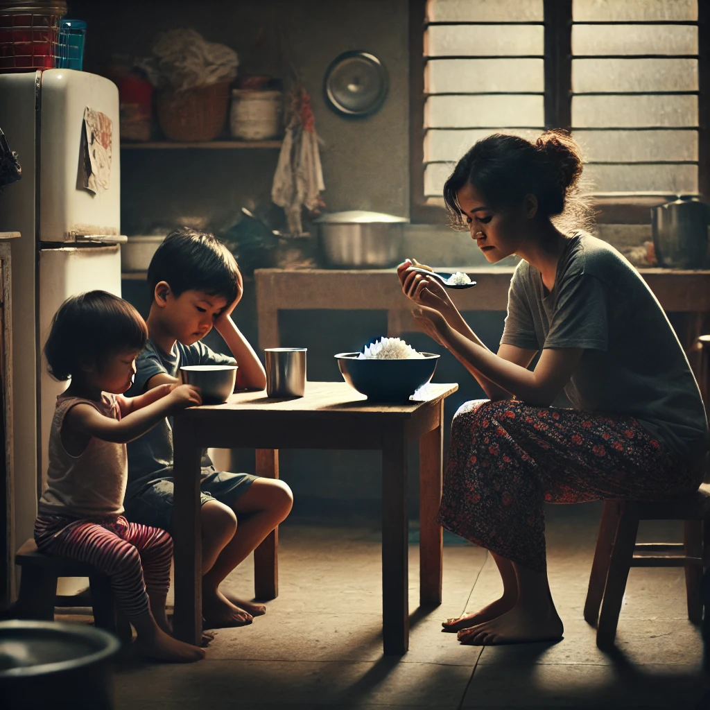 Bersyukurlah Anda yang bisa sarapan dengan nasi dan lauknya. Saya hanya punya nasi sisa semalam. Suamiku hanya satpam di pabrik. Sekarang tak ada uang lembur, sehingga tak ada telur atau tahu di meja makan.