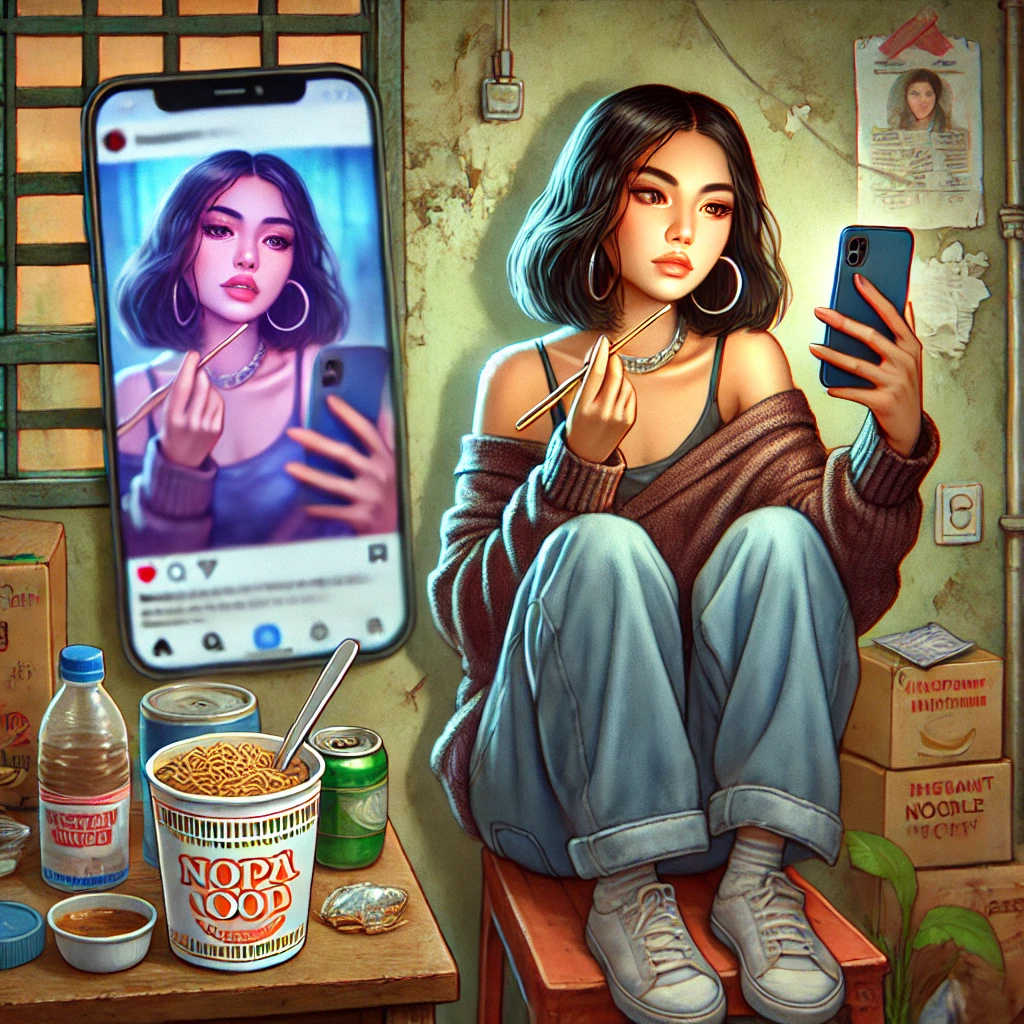 Suatu malam, saat membuka notifikasi di kamar kos sempitnya yang cat dindingnya mulai mengelupas, ia melihat story sahabat lamanya, Dira. Isinya sederhana: video Dira sedang membantu ibunya membungkus nasi bungkus di dapur rumah. Caption-nya: “Hidup nggak harus wah, yang penting nyata.”