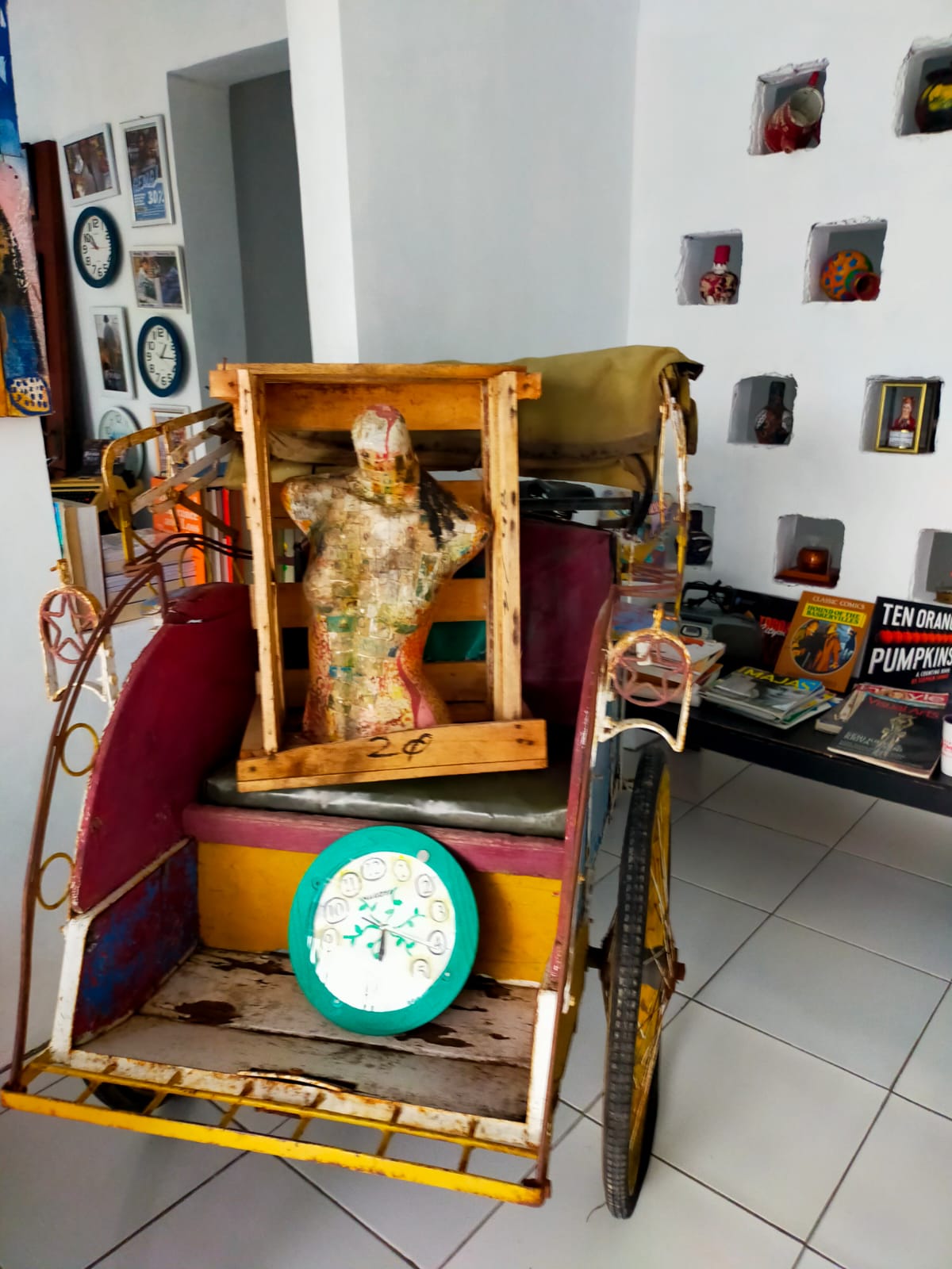 Becak, jam dinding, dan manequin telanjang setengah badan perempuan tanpa kepala dan kaki. Maksudnya apa? Tebak saja sendiri.