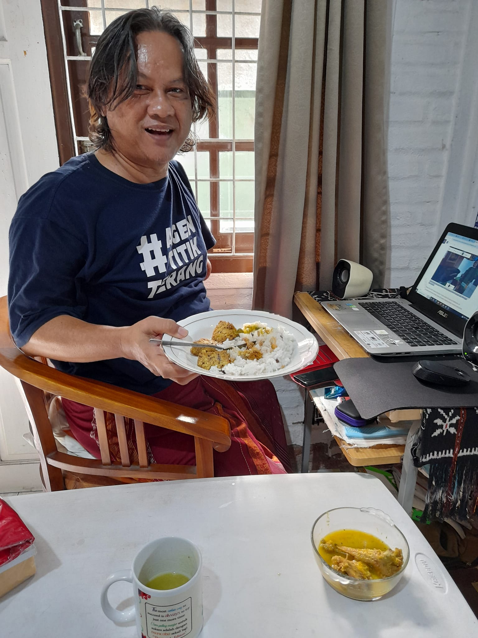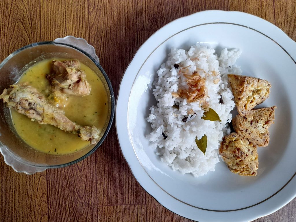 Selamat pagi dari piring hubby! Nasi daun jeruk dan cengkeh itu sebenarnya adalah nasi putih belaka tanpa rasa. Hanya setelah diberi tambahan rempah jadi wangi. Lauknya nugget tahu buatan sendiri campur abon ikan, tanpa tepung roti karena ternyata habis. Tapi kutambah oatmeal ke dalam tahu sebelum dikukus.