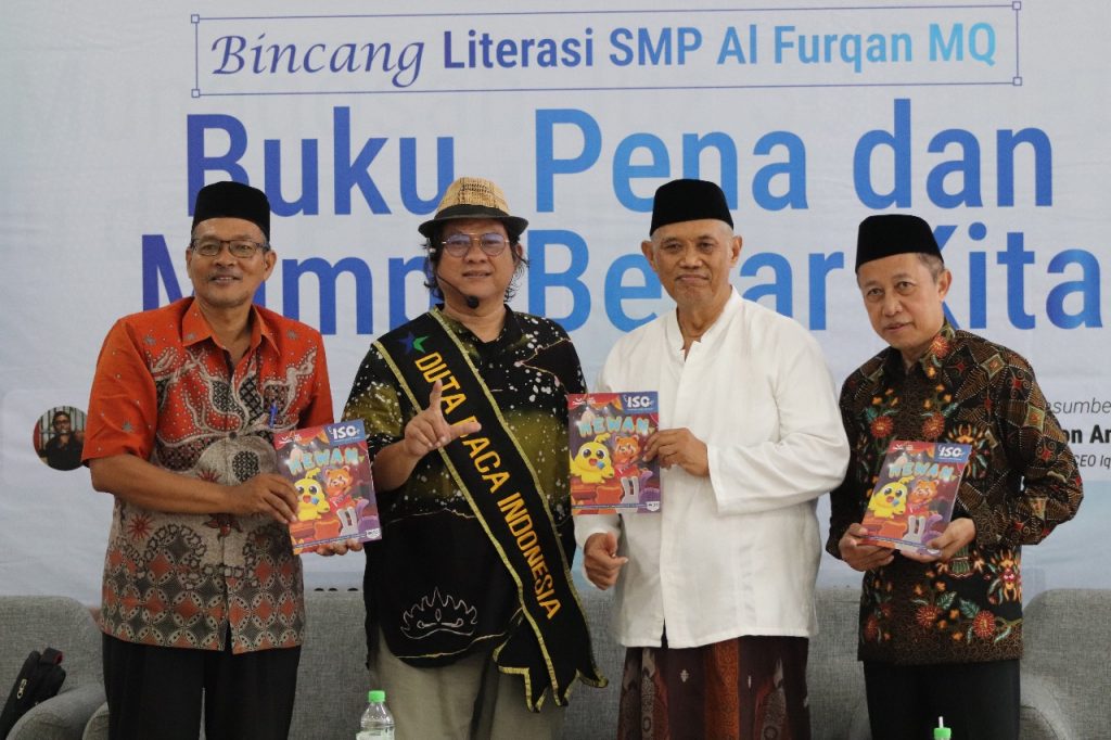 Duta Baca Indonesia, Gol A Gong, membakar semangat untuk berkarya, terlebih dalam bidang tulisan, di hadapan ratusan santri SMP Al-Furqan Madrasatul Qur’an (MQ) Jombang, Jawa Timur, pada Sabtu (20/09/25), yang diadakan di Aula Yayasan Madrasatul Qur’an.