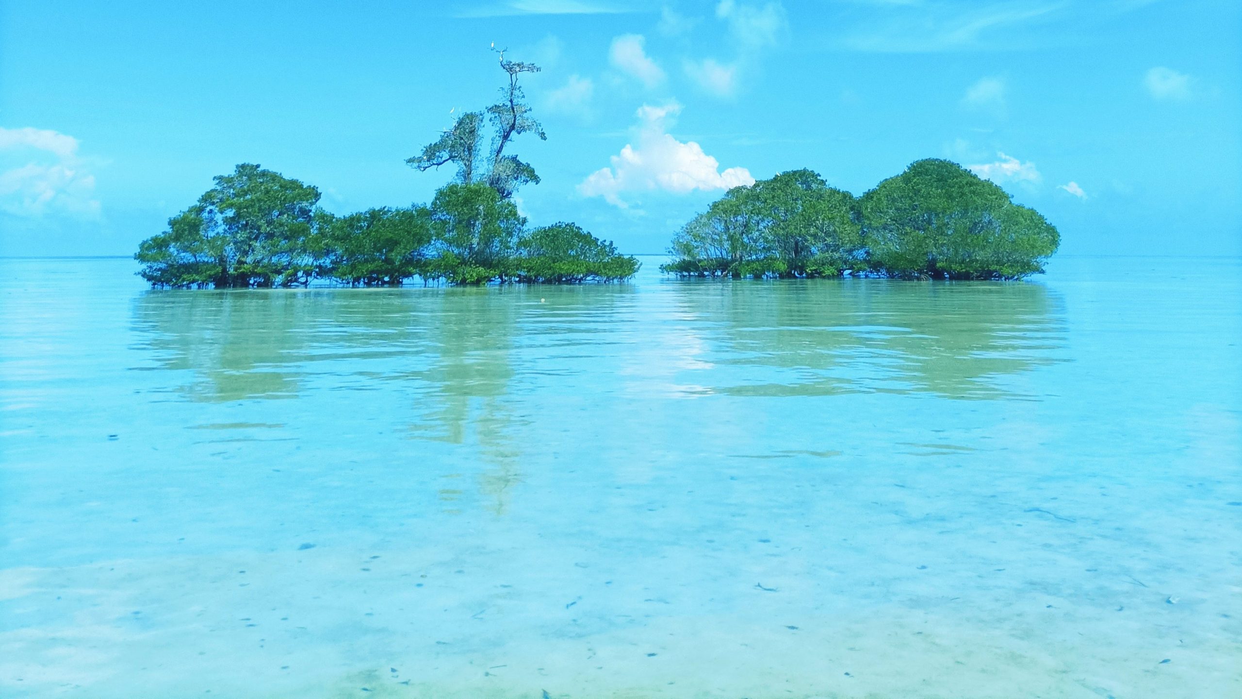 Pulau kecil ini dikelilingi oleh pasir putih, sementara di tengahnya tumbuh subur tanaman hijau dan beberapa pohon kelapa yang melambai-lambai diterpa angin. Selain itu, perairan biru dan jernih yang mengelilingi pulau menambah keindahan view Pulau Spongebob ini.