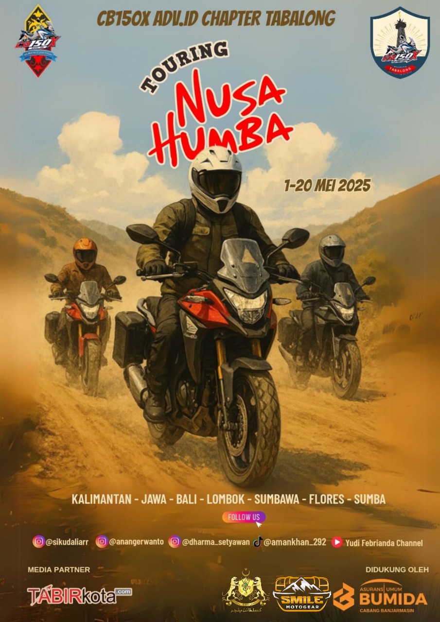 Empat rider dari komunitas CB150X ADV.ID Chapter Tabalong akan memulai perjalanan lintas pulau bertajuk Touring Nusa Humba 2025 pada 1–20 Mei mendatang. Touring ini bukan sekadar perjalanan bermotor, tetapi sebuah misi budaya yang menyusuri pulau-pulau di timur Indonesia—mulai dari Surabaya, Bali, Lombok, Sumbawa, Flores, hingga Sumba—untuk merajut kembali jalinan budaya, sejarah, dan rasa dalam satu lintasan bernama Nusantara.