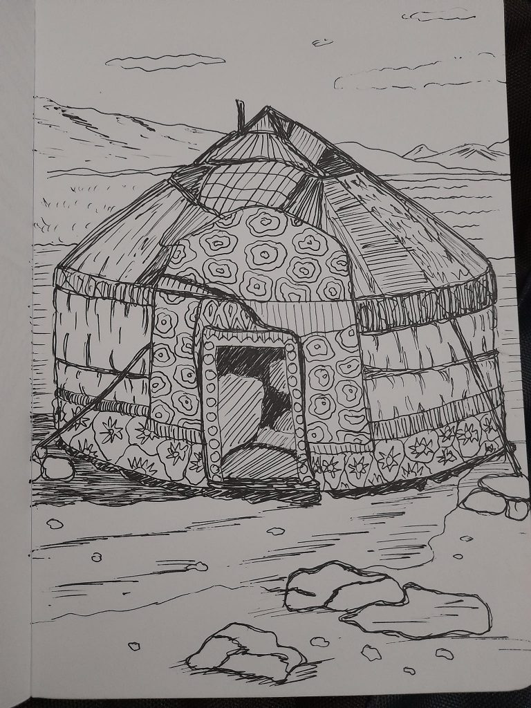 Akhirnya cari di internet dan menemukan foto tenda yurt suku nomaden berlatar belakang danau Song Kol di Kirgistan. Siapa tahu nanti kesampaian ke negara itu dan negara tan-tan lainnya. Siapa tahu. Insyaallah. Alhamdulillah bisa setor drawing yang agak terlambat. Tak apa, aku hanya memenuhi tantangan diri sendiri. Allahumma baarik ‘alai