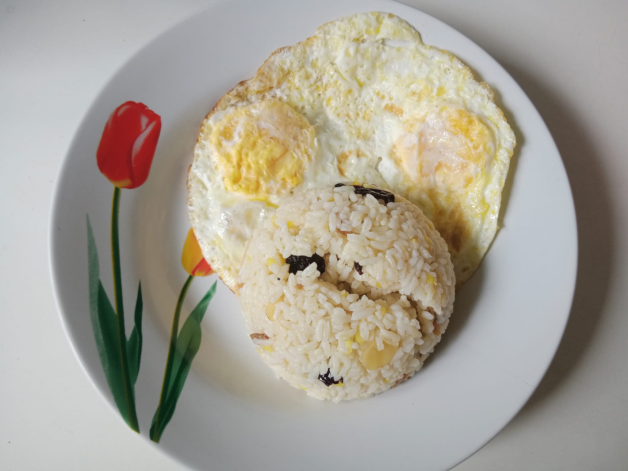 Selamat pagi dari piring hubby! Pagi ini nasgor lagi! Bumbunya kismis, cengkeh, nanas, almon iris, dan garam. Lauknya sesuai rikues hubby: telor mata sapi. Setelah dihidangkan, hubby tanya mana semur ayamnya. Oh iya! Brb, langsung, sat set sat set, aku ambil semur ayam frozen. Gaya, yak. Hahaha.Itu semur ayam yang nggak habis, kusimpan di freezer. Jadi biar cepat kuambil secukupnya, iris tipis daging ayamnya. Hangatkan kuah semur sedikit, masukkan daging ayam iris. Siap juga semangkuk semur ayam yang tidak sempat difoto.
