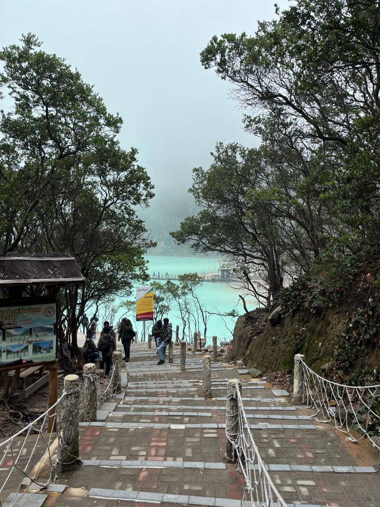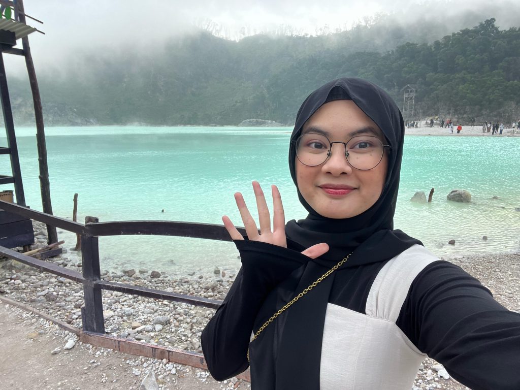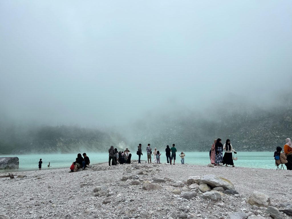 Aslinya Kawah Putih itu jauh lebih cantik daripada yang sering muncul di internet. Warna airnya tuh gradasi putih kehijauan, adem banget dilihatnya. Ditambah lagi kabut tebal yang memperindah pemandangan. Udah gitu, udara di sana juga lebih dingin dari yang aku kira, aku suka bangett, tapi kalau kamu mau ke sana, mending siapin jaket biar gak menggigil.
