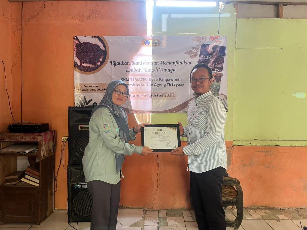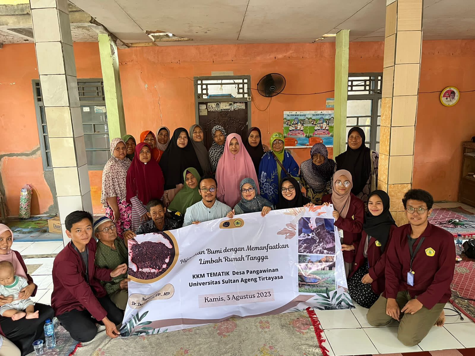 Mahasiswa KKM Tematik Kelompok 16 Universitas Sultan Ageng Tirtayasa (Untirta) mengadakan sosialisasi Pupuk Kompos, yang berasal dari sampah rumah tangga. Acara dilaksanakan pada Kamis (4/7/2023), diusung dengan tema “Hijaukan Bumi dengan Memanfaatkan Limbah Rumah Tangga”. Bertempat di Kampung Pangawinan, Desa Pangawinan, Kecamatan Bandung, Serang, Banten.