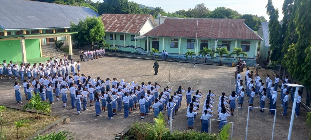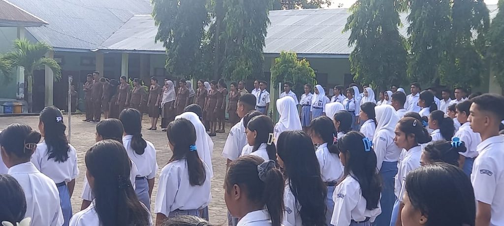 Anak anak SMK Sura Dewa di bawah sinar terik mentari pagi dengan hikmat mendengarkan penjelasan dari Kasalantas sebagai pemimpin upacara pagi ini di SMK Sura Dewa.