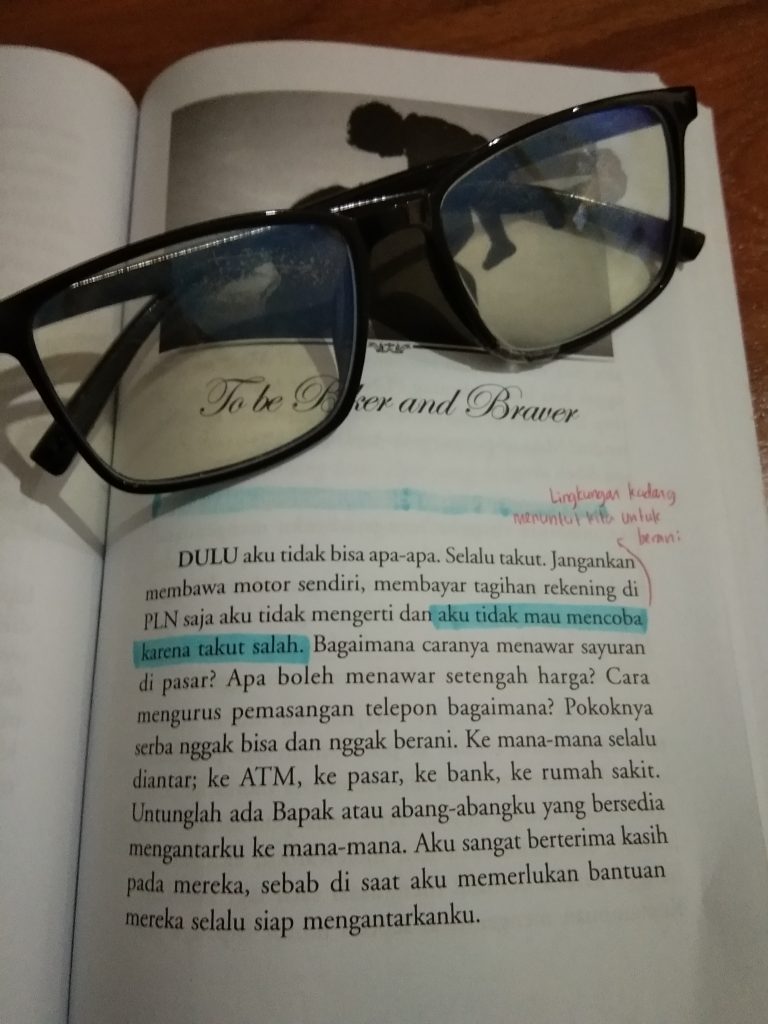“Dulu aku tidak bisa apa-apa. Selalu takut. Jangankan membawa motor sendiri, membayar tagihan rekening di PLN saja aku tidak mengerti dan aku tidak mau mencoba karena aku takut salah.” (halaman 73).