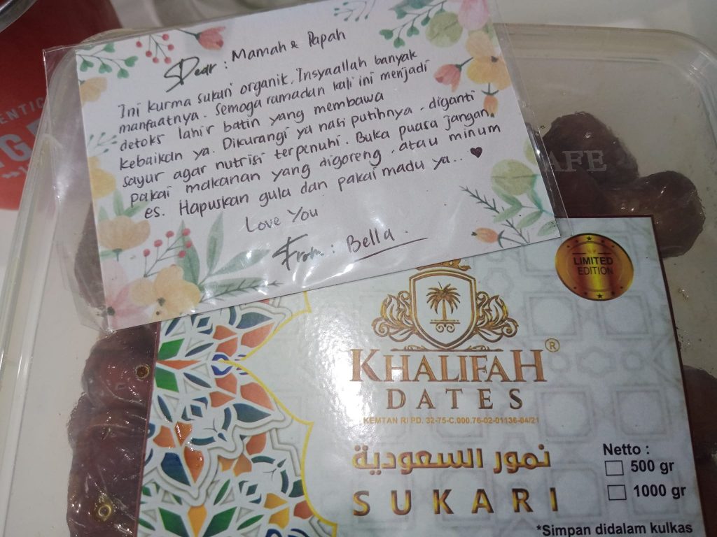 Sampai sekarang pun aku masih belajar. Anak-anak itu adalah ibuku, yang mengajari, menjaga, mengingatkan, bahkan menasehati. Seperti foto di bawah ini, betapa kentara perlakuan anak sulungku ‘mengibukan dirinya’ ketika mengirim hadiah buah kurma untuk bernuka puasa.
