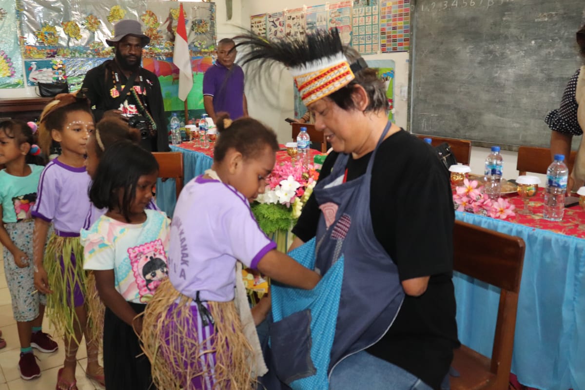 Di celemek ajaib Paman Gong ada pelajaran karakter budaya antre. Setiap anak diberikan haknya untuk mengambil hadiah (bukan disumbang) dengan cara antre. Foto ini saat di Merauke, Kabupaten Papua Selatan, 24 Oktober 2022.