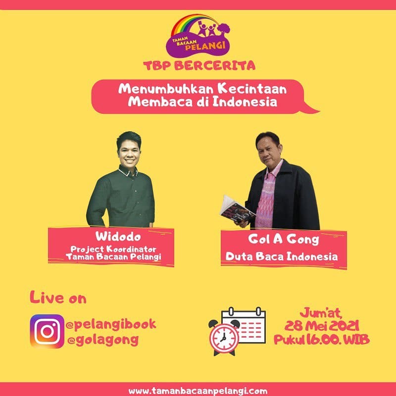 Dalam rangka memeriahkan Hari Buku Nasional, Taman Bacaan Pelangi akan melakukan diskusi daring dengan tema “Menumbuhkan Kecintaan Membaca di Indonesia” bersama Gol A Gong (Duta Baca Indonesia).