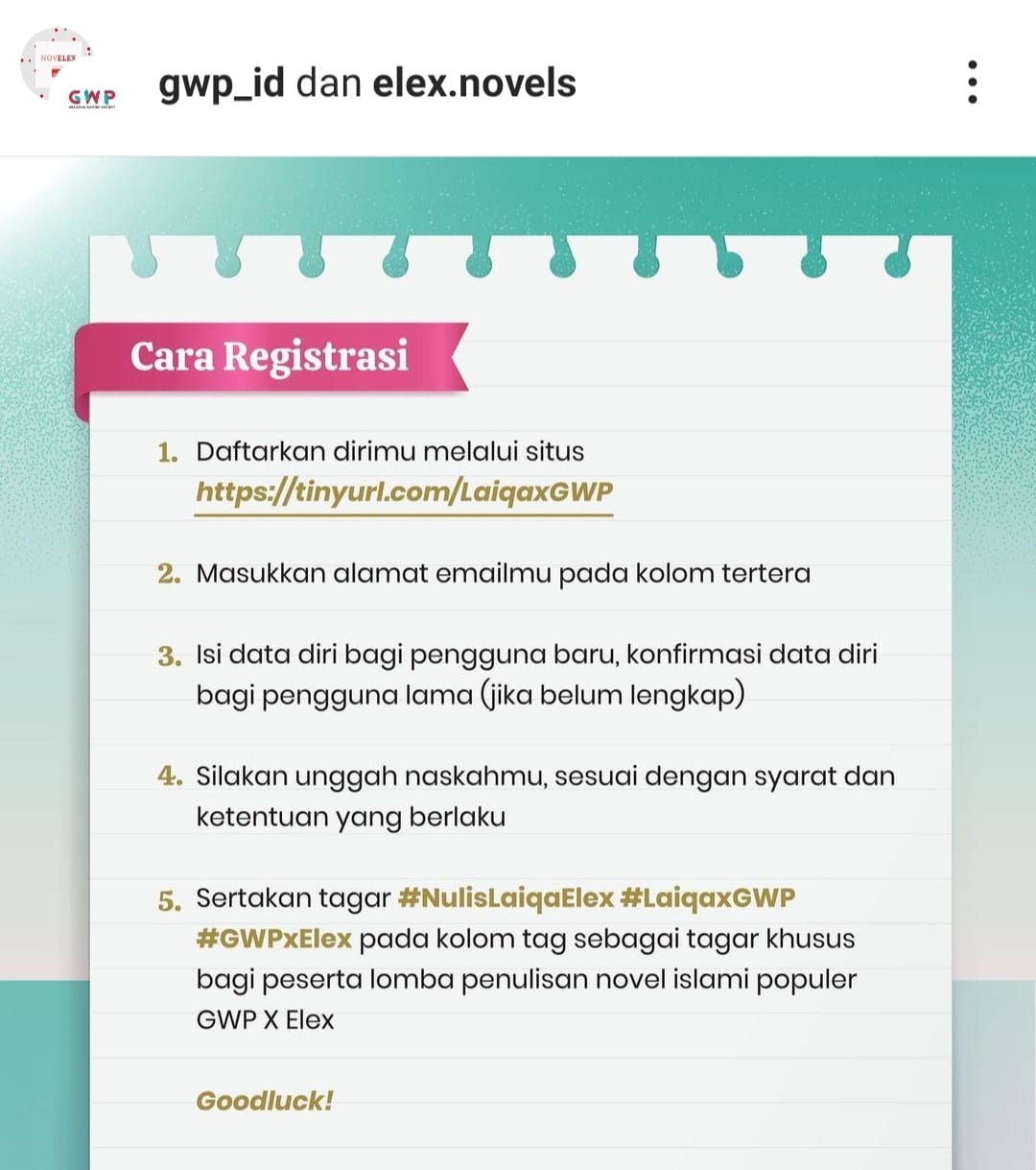 Sebar berita ini ke teman-teman lain juga, ya! Kami tunggu unggahan naskahmu di GWP.id. Lomba Penulisan Novel Islami GPW x Elex. Semangat!