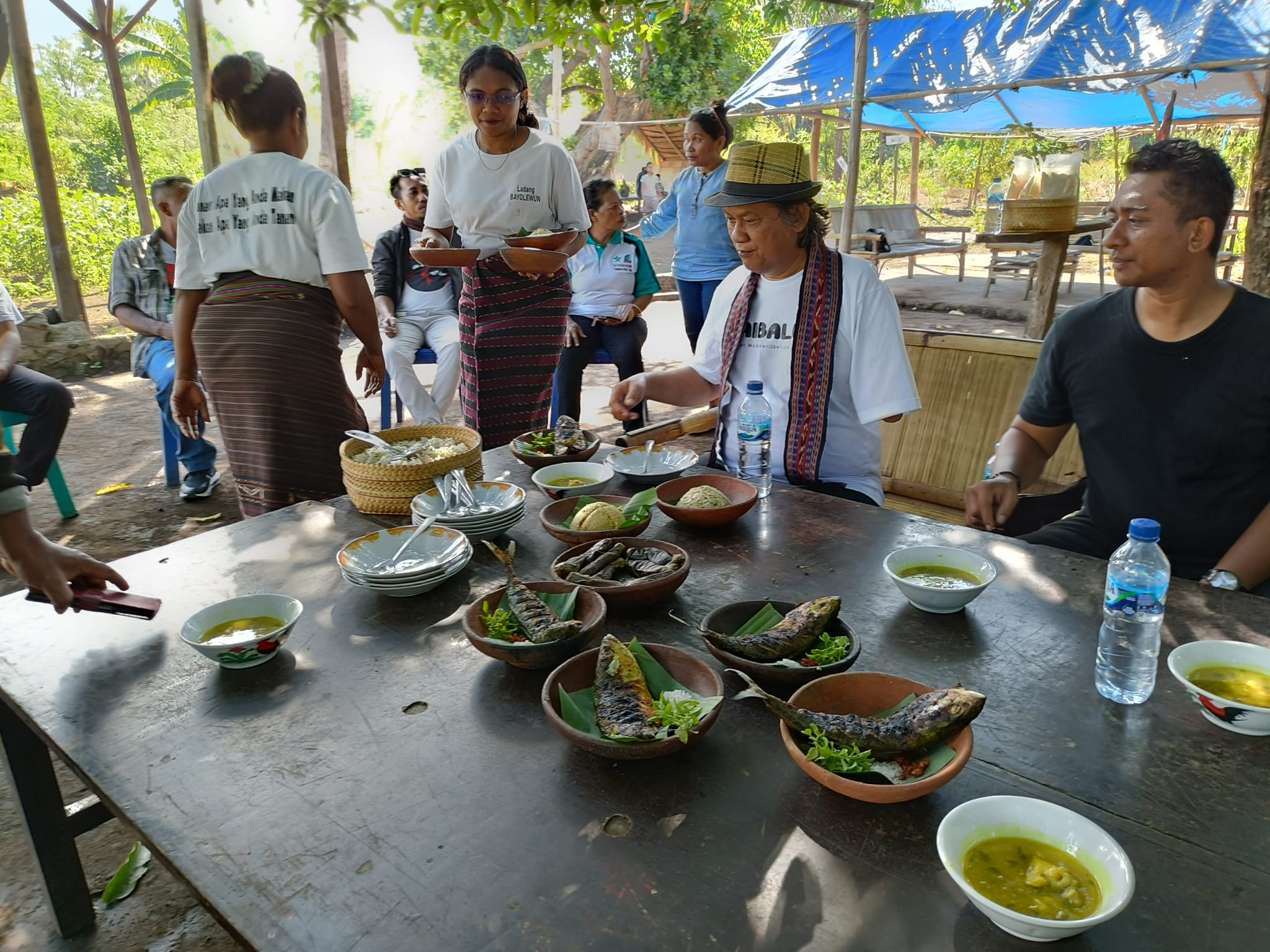 Setelah di pondok baca Nubun Puhun, kami semua lapar. Maksimum Masan Kian dari PGRI dan Valentinus Waton, Kadis Perpustakaan dan Kearsipan Flores Timur membawa kami makan siang di Ladang Bayolewu, Sabtu 3 Agustus 2024. Pemiliknya Jamilus Tupen Jumat, menjadikan Ladang Bayolewun, Adonara sebagai destinasi kuliner yang mengasyikan. Kata Makimus, “Jika ada tamu dari Jakarta, makan siangnya pasti di sini.”