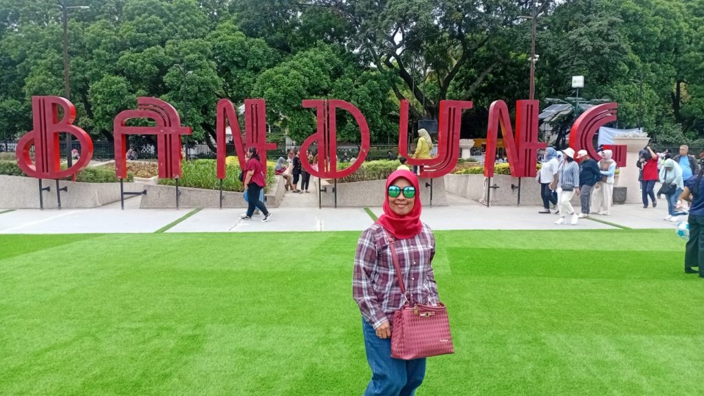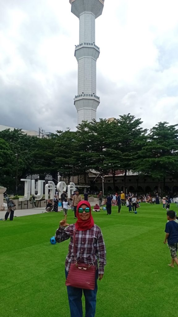 Lapangan berlapis rumput hijau sintetis di sekitar masjid menjadi tempat yang nyaman untuk bersantai, berfoto, dan menyaksikan keceriaan anak-anak—bahkan orang dewasa—bermain bola. Tulisan “Bandung” berukuran besar berwarna merah menyala berdampingan dengan tulisan “Juara” berwarna putih bersih, menciptakan nuansa layaknya bendera merah putih. Setiap sudutnya terasa sangat instagramable.