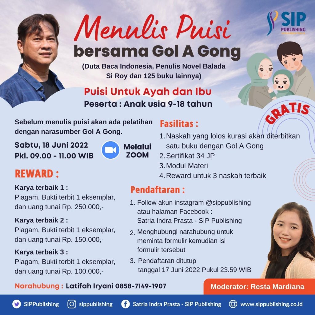 Sabtu tanggal 18 Juni 2022 menjadi salah satu hari yang istimewa bagi SIP Publishing dan peserta pelatiha menuils puisi bersama Gol A Gong. Di hari tersebut kami dapat belajar bersama Duta Baca Indonesia untuk menulis puisi.