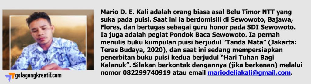 PUISI MINGGU terbit setiap hari Minggu. Silakan mengirimkan 5 hingga 10 puisi tematik. Sertakan foto diri dan gambar atau foto ilustrasi untuk mempercantik puisi-puisinya. Tulis bio narasi dan pengantar singkat. Kirimkan ke email : gongtravelling@gmail.com . Ada uang pengganti pulsa Rp 200.000,-. Sertakan nomor WA, nama bank dan nomor rekeningnya.