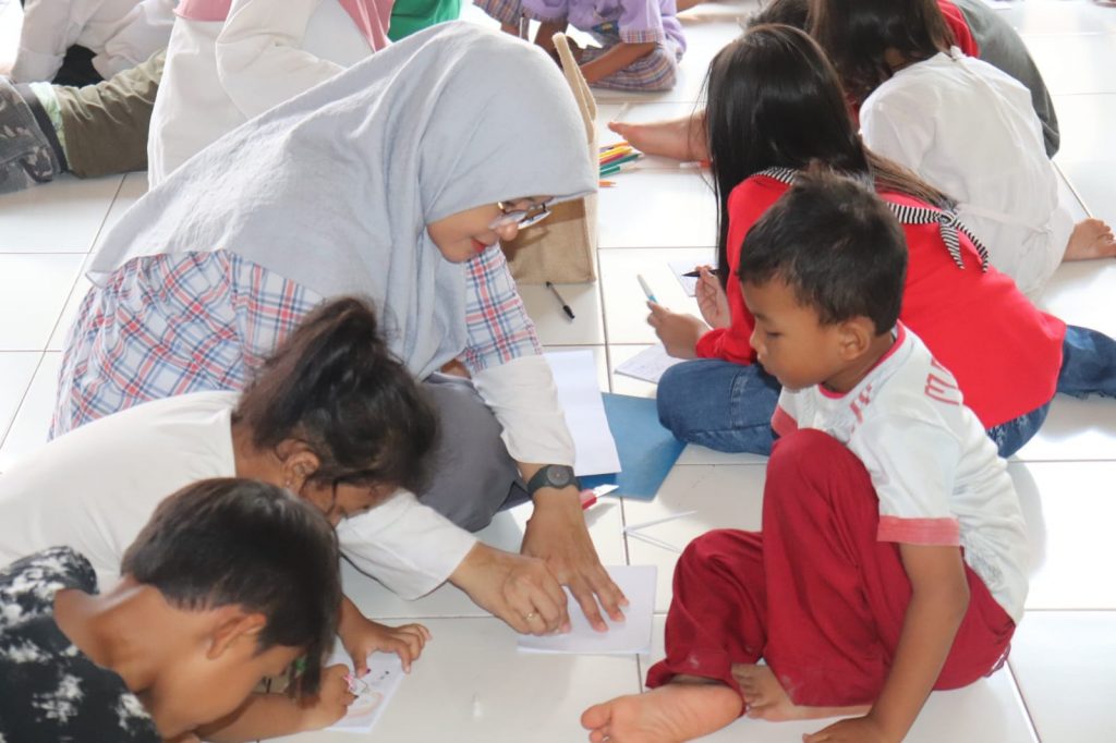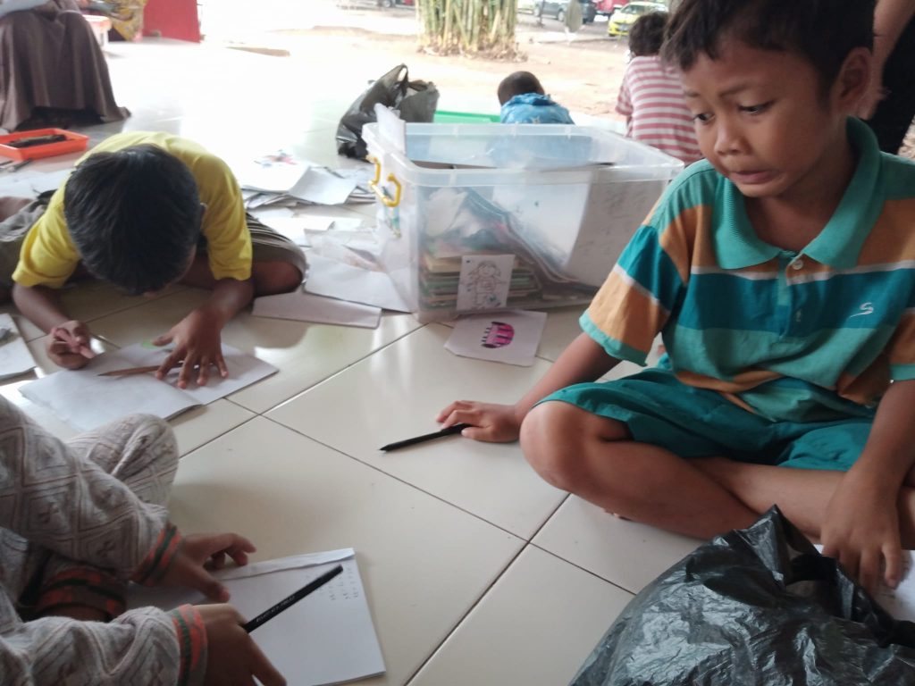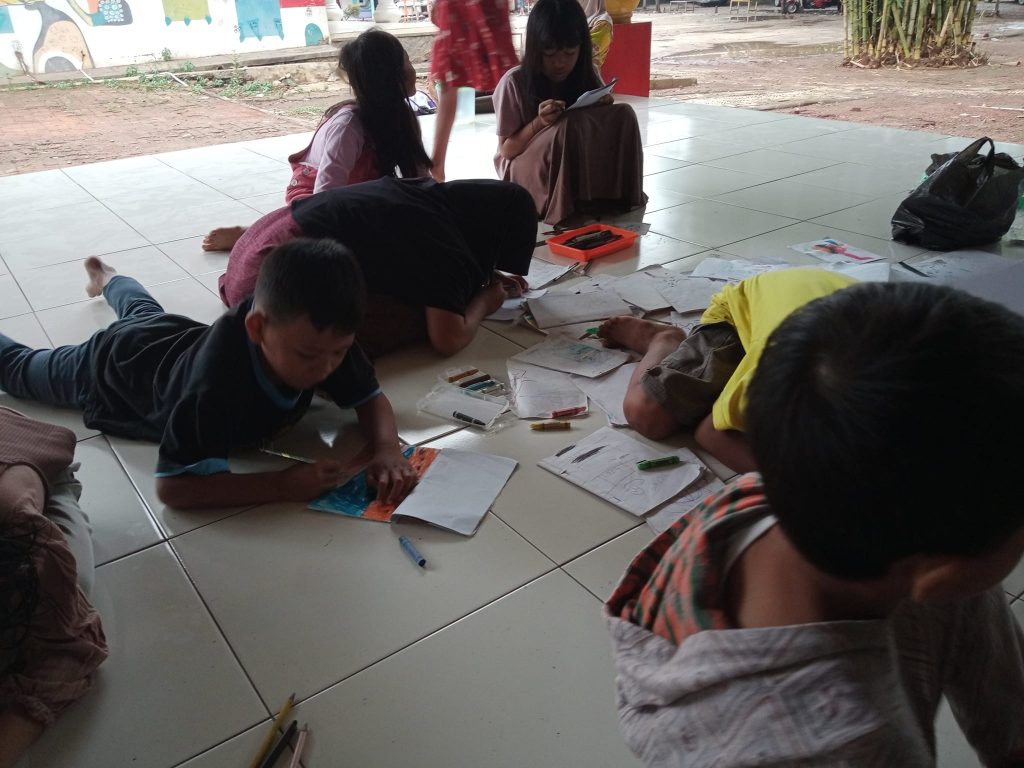 Namun, sampai di pendopo Kaibon Rumah Dunia ternyata anak-anak masih menunggu aku. Jadilah begitu aku datang membawa snack, mereka baru mulai bergiat. Haduh, ini mah bakal menghabiskan waktu satu jam, pikirku. Yaudahlaya, kasihan anak-anak yang sudah menunggu.