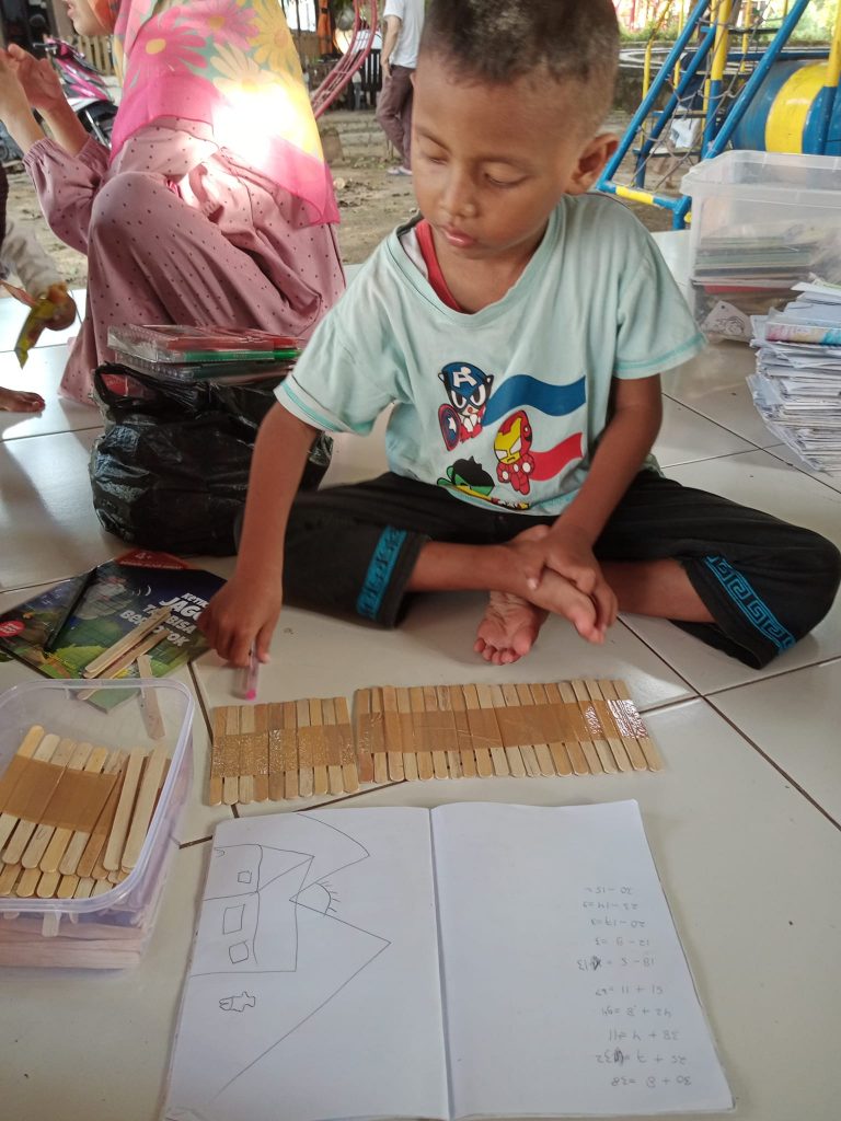 Aku sendiri sebenarnya tidak masalah berapa orang yang akan datang. Setiap menggelar peralatan, aku sibuk sendiri dengan ide-ide mengajar esok hari. Saat menunggu anak-anak datang, aku bisa menyerap atmosfir sekitar dan lebih mengenal kebutuhan anak-anak akan pelajaran selanjutnya. Jika di rumah atau di lain tempat, aku hanya berpijak pada teori dan perkiraan.