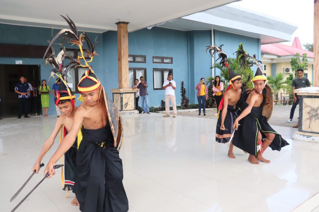 Upacara penyambutan dengan tarian adat dan menyelempangkan kain tenun sudah jadi tradisi. Biasanya dibumbui dengan mengunyah sirih atau minum seteguk tuak. Tapi di sini tidak ada minum tuak.